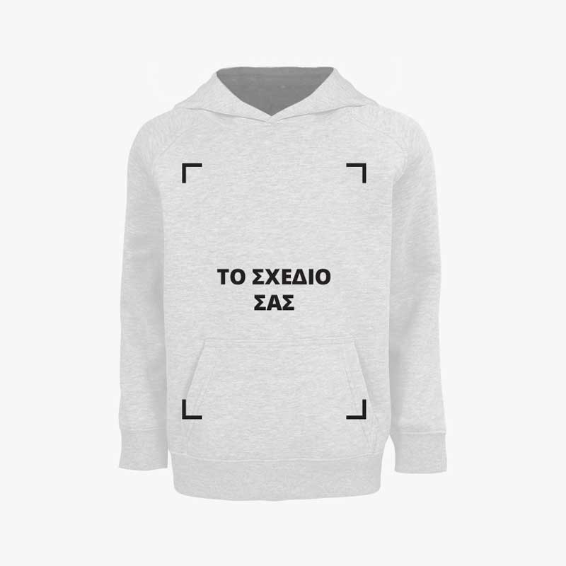 Φτιάξε το δικό σου παιδικό φούτερ κουκούλα με στάμπα. Φούτερ βάρους 280g/m² – τρίκλωνο, με τσέπη καγκουρό, επενδυμένη κουκούλα jersey χωρίς κορδόνια, 2χ2 ριπ στις μανσέτες και την μέση.